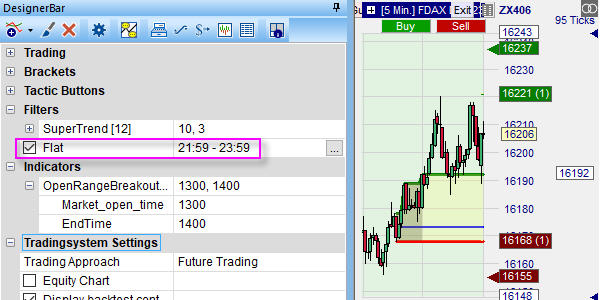 Birger Schäfermeier hält keine Positionen nach Marktschluss. Aus diesem Grund hat er seiner Strategie einen Zeitfilter hinzugefügt. Dieser Zeitfilter wird die offene Position um 21:59 Uhr automatisch zum Marktpreis schließen, vorausgesetzt der Zeitfilter ist angehakt und der TradeGuard aktiviert.