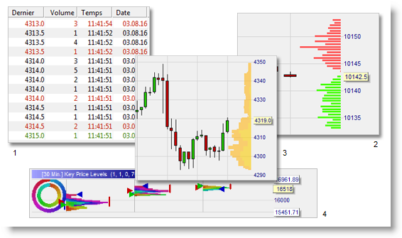 Les informations fournies par la bourse sont converties par la plateforme NanoTrader dans des outils uniques pour scalpers comme les histogrammes des ordres (2), les histrogrammes des exécutions (3) et les Key Price Levels (4).
